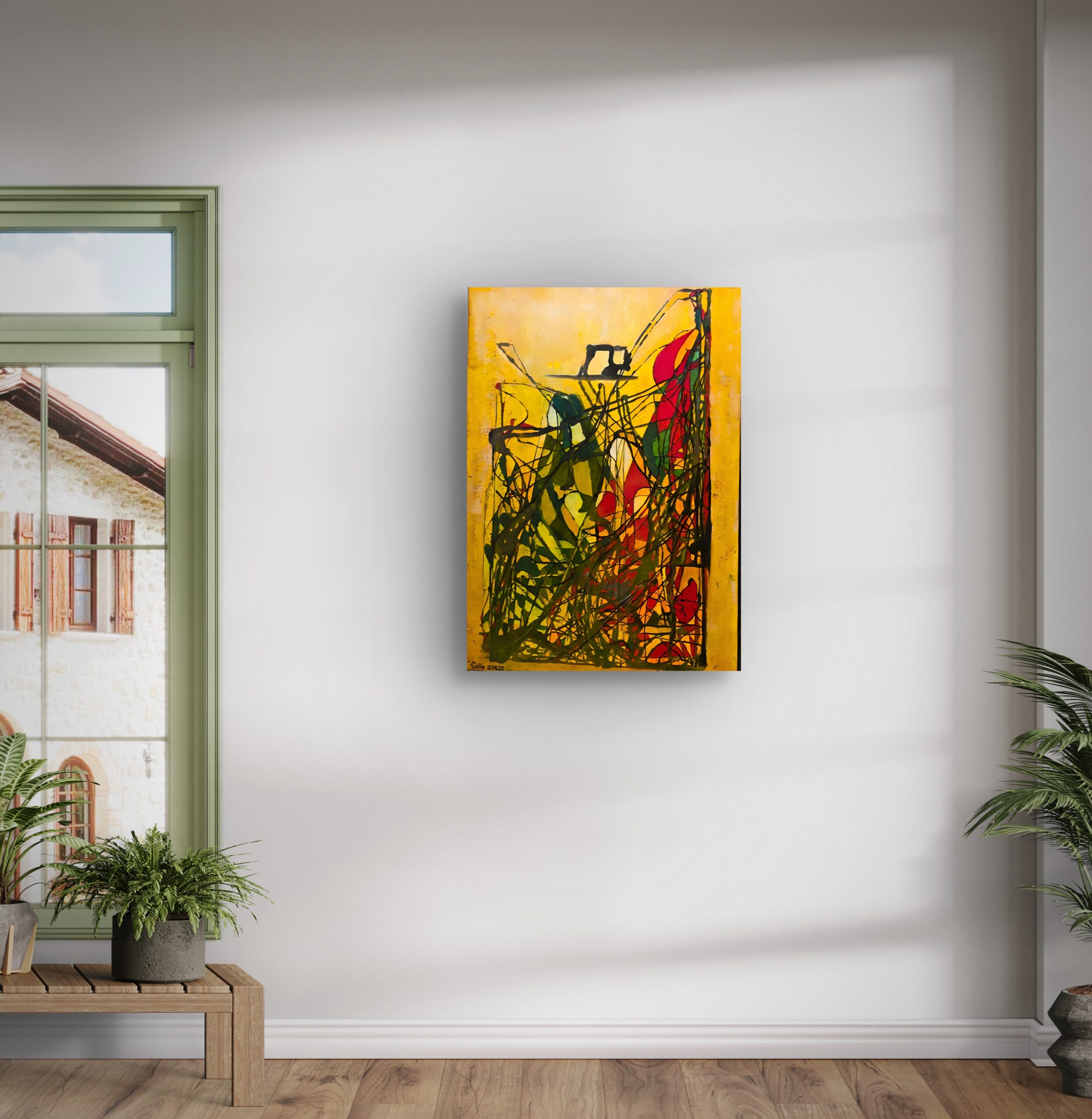 A vivid abstraction built on the contrast of a glowing yellow background and a web of dark lines. Within this network, patches of green, red, and orange appear like fragments of a mosaic held together by invisible threads. The composition evokes the sense of a labyrinth—complex yet alive—where chaos transforms into structure. The symbolism of “Ariadne’s threads” suggests a search for direction, a link between inner and outer worlds, and a movement from confusion to clarity.