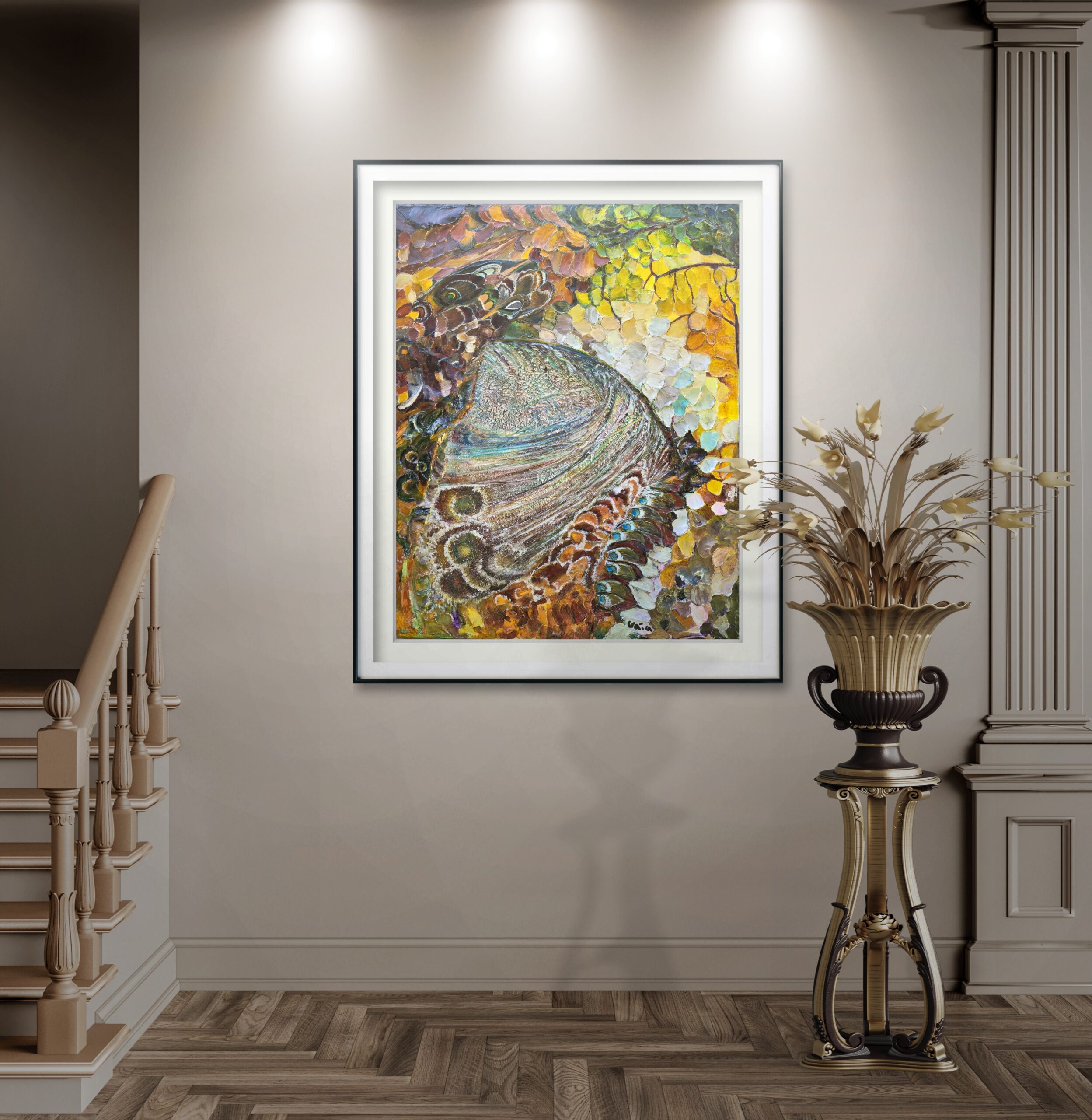 A fragment of a butterfly wing shimmers in the corner, its eye-like markings gazing outward as though carrying ancient knowledge. Around it, the canvas swirls with golden textures and weathered reliefs, reminiscent of stone walls or cosmic dust left from the birth of time. The wing is both fragile and eternal — a remnant of fleeting life, yet glowing with the quiet light of memory. The painting evokes the sensation of touching something primordial, where nature and eternity breathe as one.