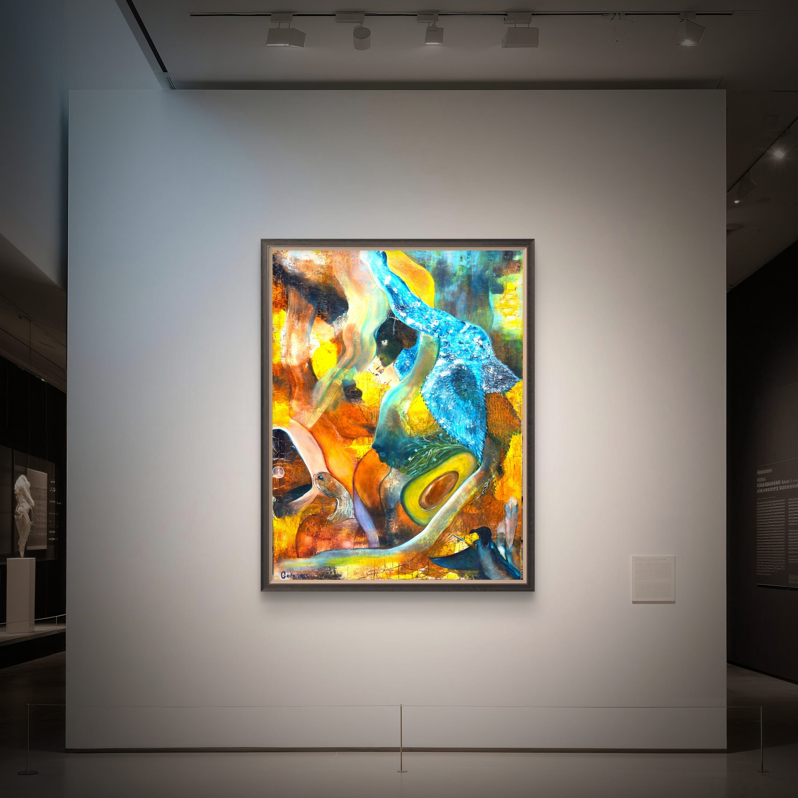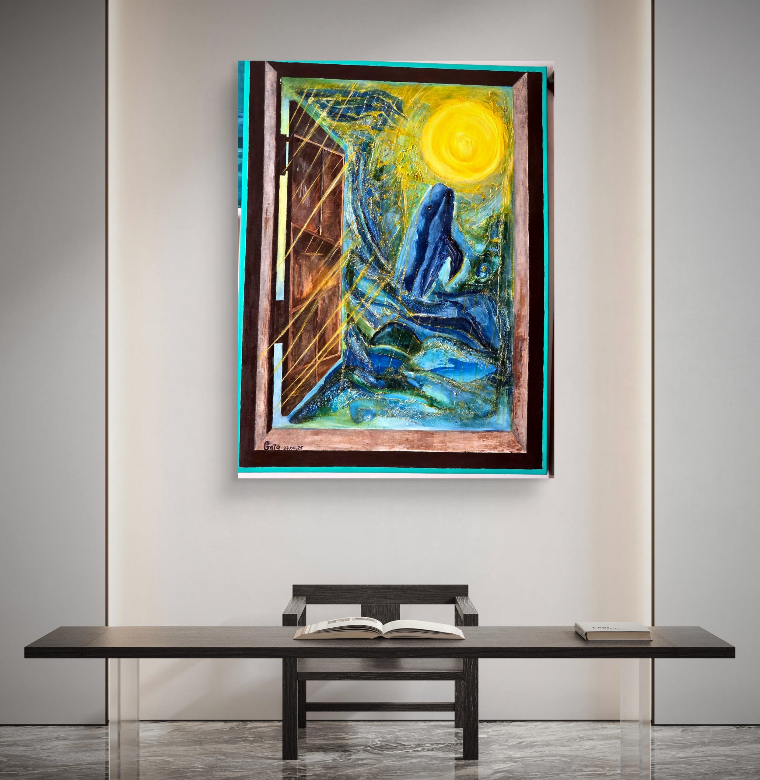 From the depths of the blue ocean, as if from the memory of the element itself, the figure of a whale rises. Its movement reaches toward the sun — a radiant, pulsating circle of light that floods the space with golden rays. Through the open frame bursts this brilliance, breaking through shadow and cold, intertwining with streams of water and light like the very veins of life. In this dance one feels release, the breath of the cosmos, a meeting of primal power and tenderness. The work resonates as a hymn to joy, born in the act of crossing boundaries — from depth to height, from darkness to radiance.