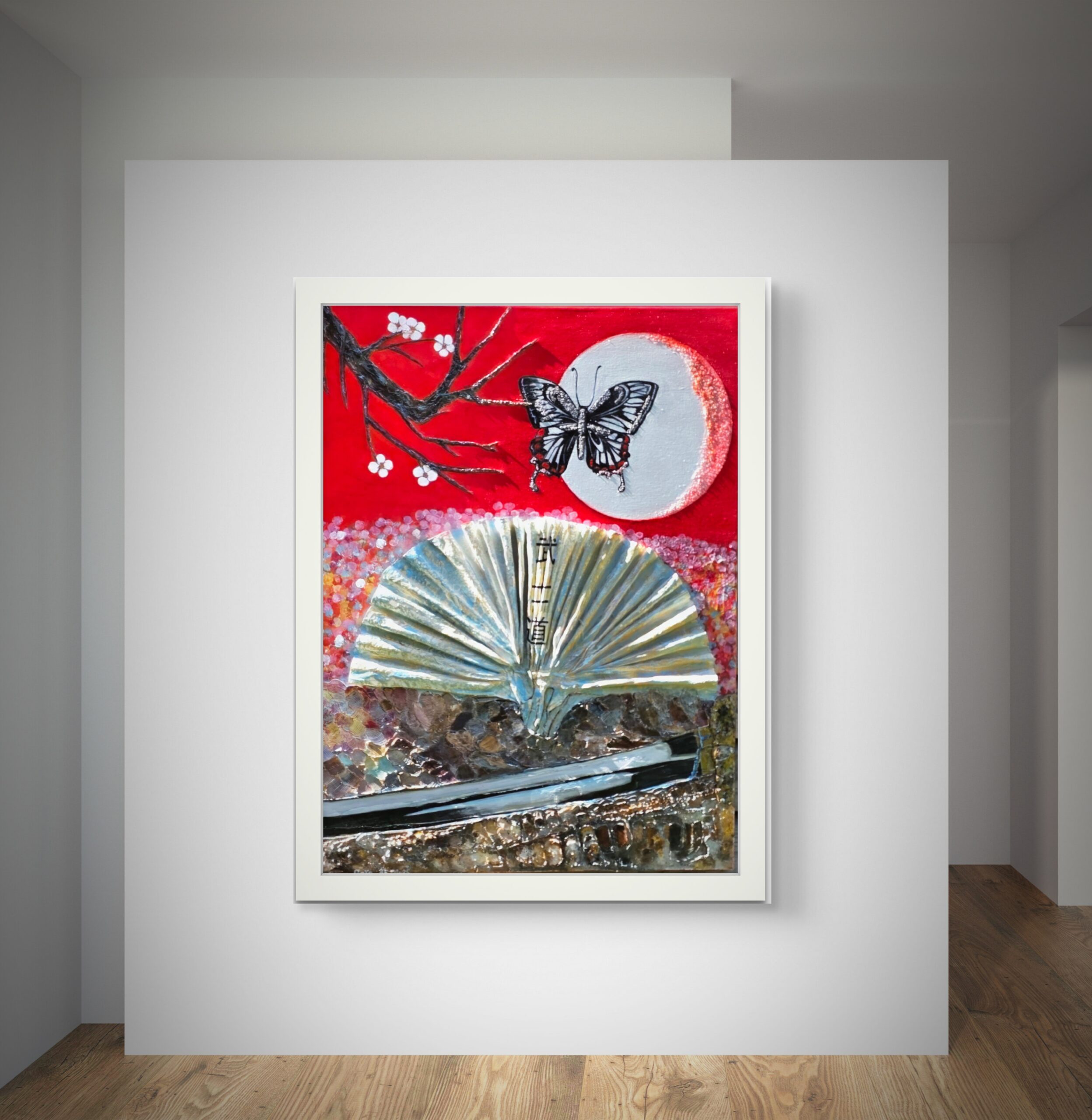 A crimson sky becomes the stage for contrasts — fragility and strength, fleetingness and eternity. The butterfly hovers before the pale moon, its wings echoing both vulnerability and freedom. Below, a fan spreads open like a silent code, marked with the vertical script of Bushidō — the path of the warrior. A sword lies at the foundation, its steel shimmering as if reflecting centuries of honor and discipline. Between blossoming branches, delicate petals, and the solemn presence of the blade, the composition unites beauty and resolve, suggesting that true strength is always balanced by grace.