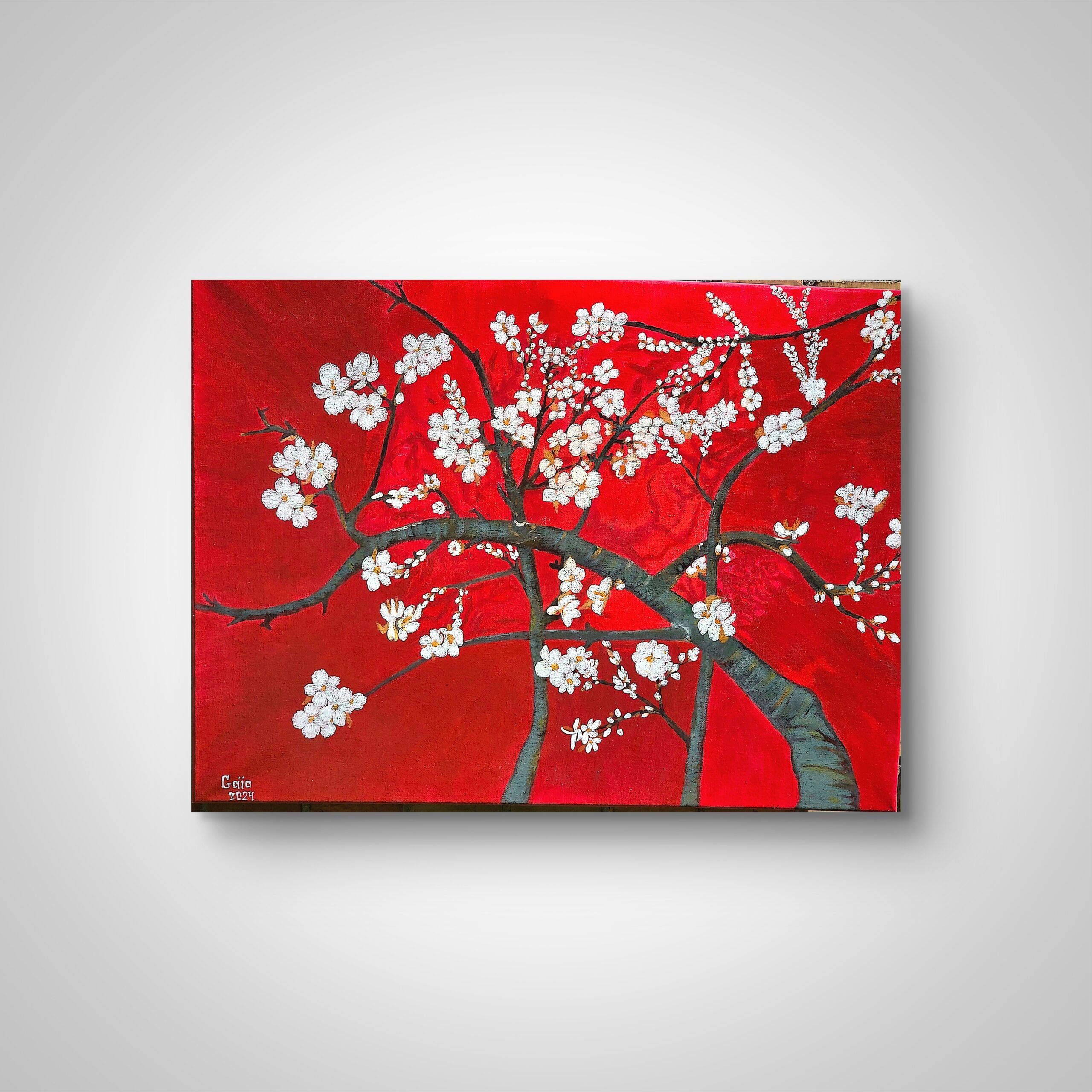 On a glowing crimson background, the fragile branches unfold in a dance of white blossoms. Each flower seems to hover between being and vanishing, echoing the fleeting beauty of spring and the transience of life. The stark contrast of delicate petals against the deep red field gives the scene a quiet intensity — a celebration of purity and impermanence. In this stillness, the painting becomes both a hymn to renewal and a meditation on the moment’s fragility.