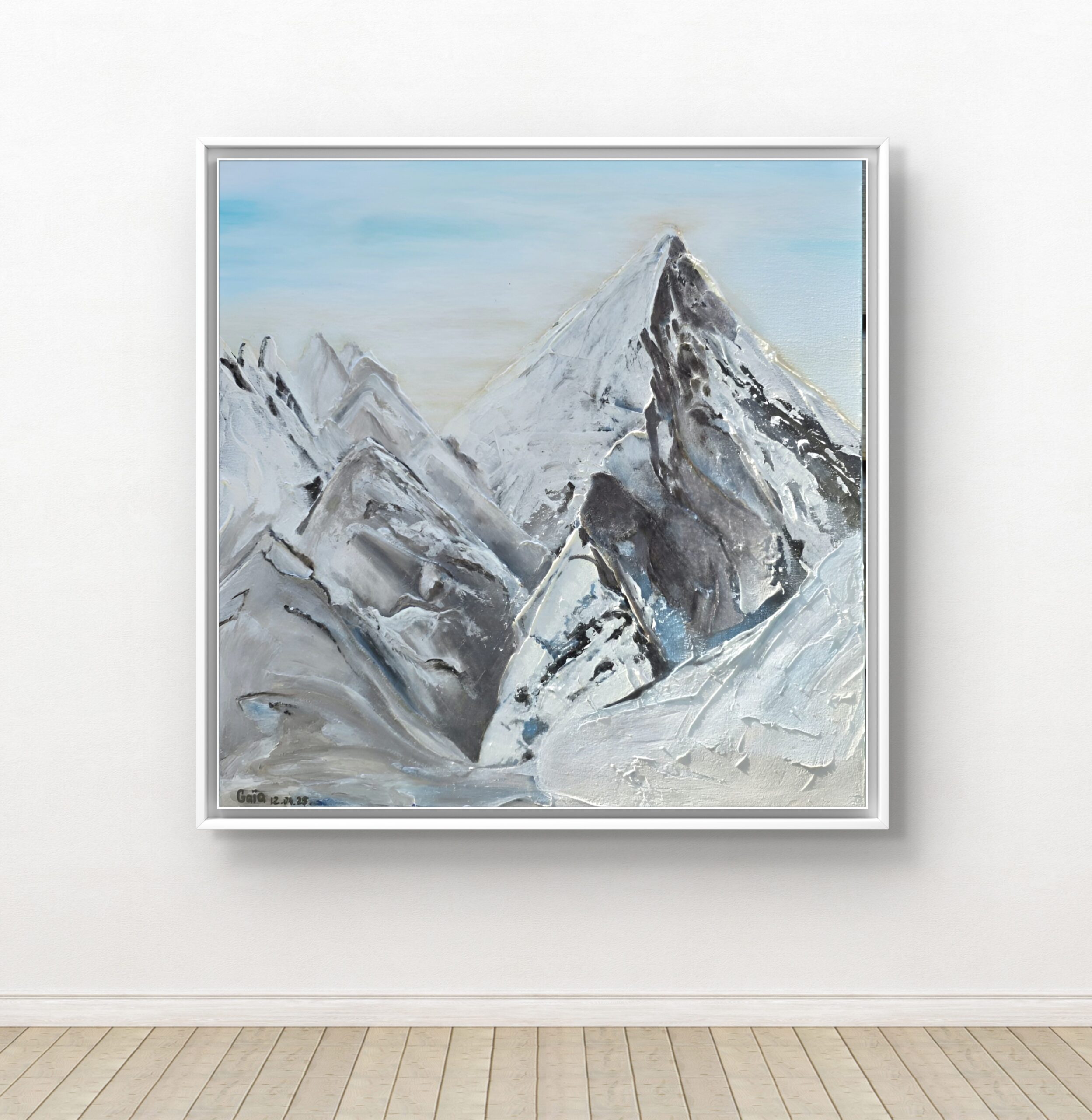 Sharp, monumental peaks rise into a pale sky, their icy slopes etched with shadows of time. The cold palette of whites, grays, and silvers conveys both silence and grandeur, as if the mountains themselves breathe eternity. Each ridge seems carved by winds and centuries, carrying an austere beauty that humbles and uplifts. This landscape is not just a view, but a meditation on endurance — on the stillness that holds immense strength within it.