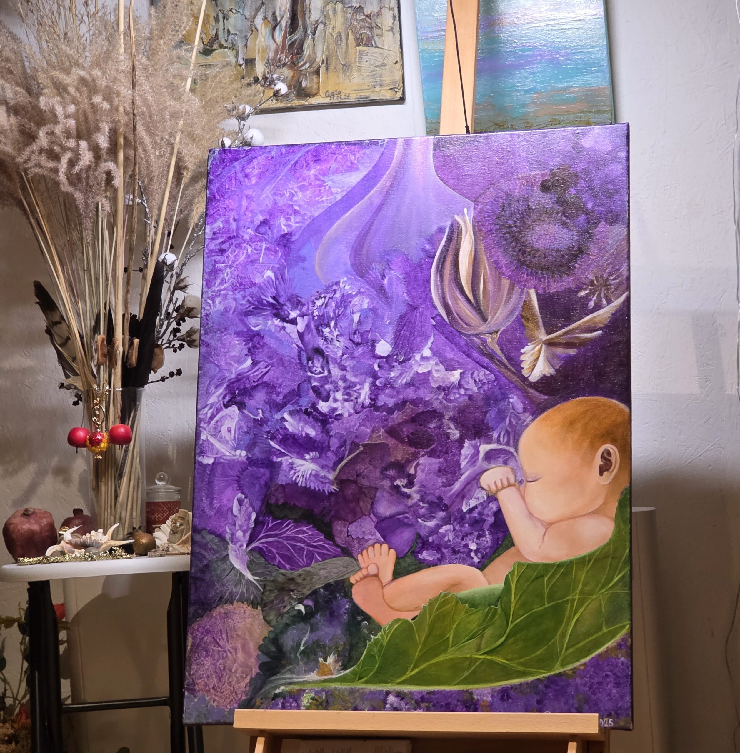 Shades of purple and green form a dreamlike cradle, where a newborn rests within a strong, vibrant leaf. Surrounded by blossoms ranging from soft lavender to deep violet, the child sleeps peacefully, embraced by nature’s quiet strength. The composition combines realism and abstraction, uniting tenderness, fragility, and the wonder of new life.