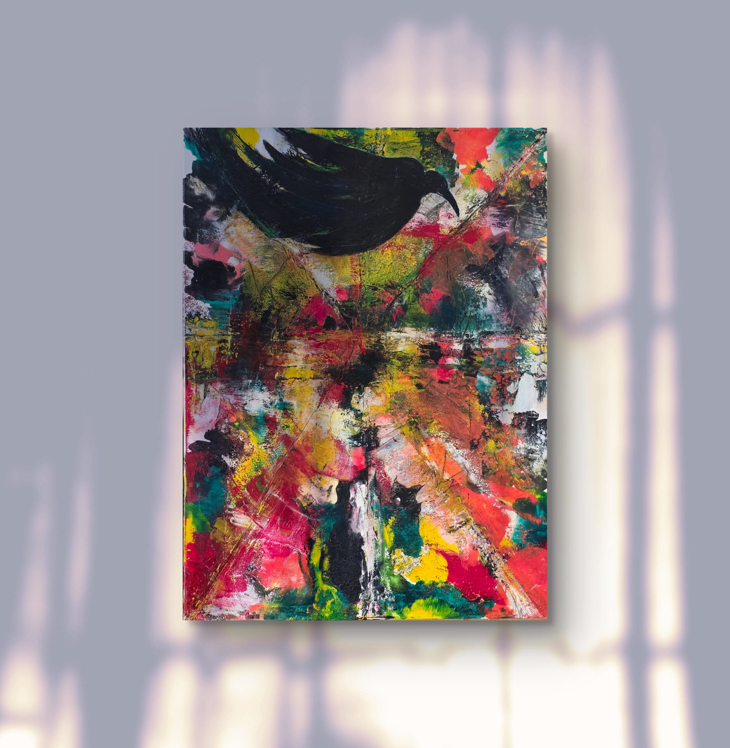 A bold and expressive composition where a black bird soars above a burst of radiant colors. Streaks of red, yellow, pink, and green clash and merge, forming an almost cosmic explosion of energy. The bird’s silhouette cuts through this storm of light, evoking memory, continuity, and the invisible thread that binds generations. The contrast between the dark figure and the vivid background suggests both fragility and strength — a flight through time, carrying the voices of those who came before.