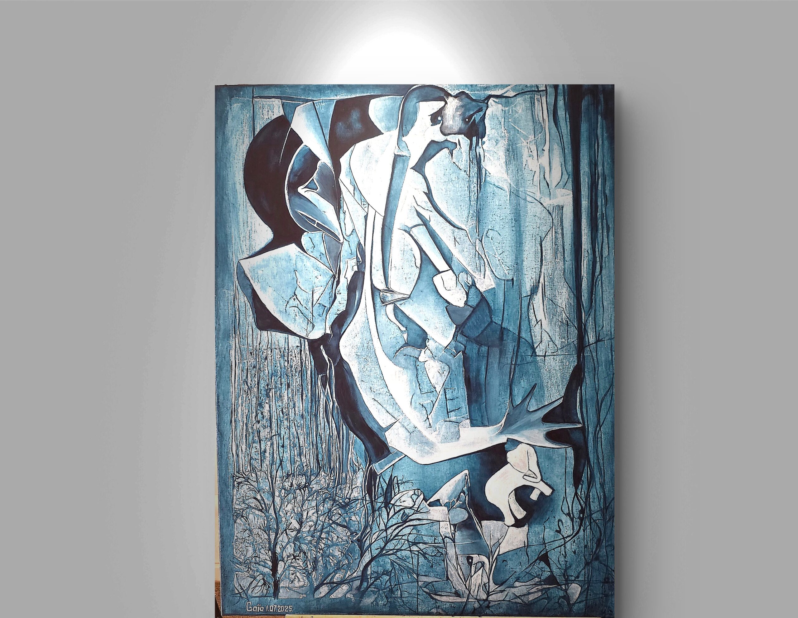 A cool-toned abstraction where crystalline forms and fractured lines create the impression of a frozen monument. Shades of blue and white flow into one another, suggesting ice, stone, and glass at once. Figures seem to emerge from within the frozen mass — fragile, elongated, almost ghostlike — as if memories were preserved in ice. At the bottom, delicate branches echo the fragility of nature, contrasting with the monumental stillness above. The work conveys both the cold silence of winter and the quiet poetry hidden within frozen time.