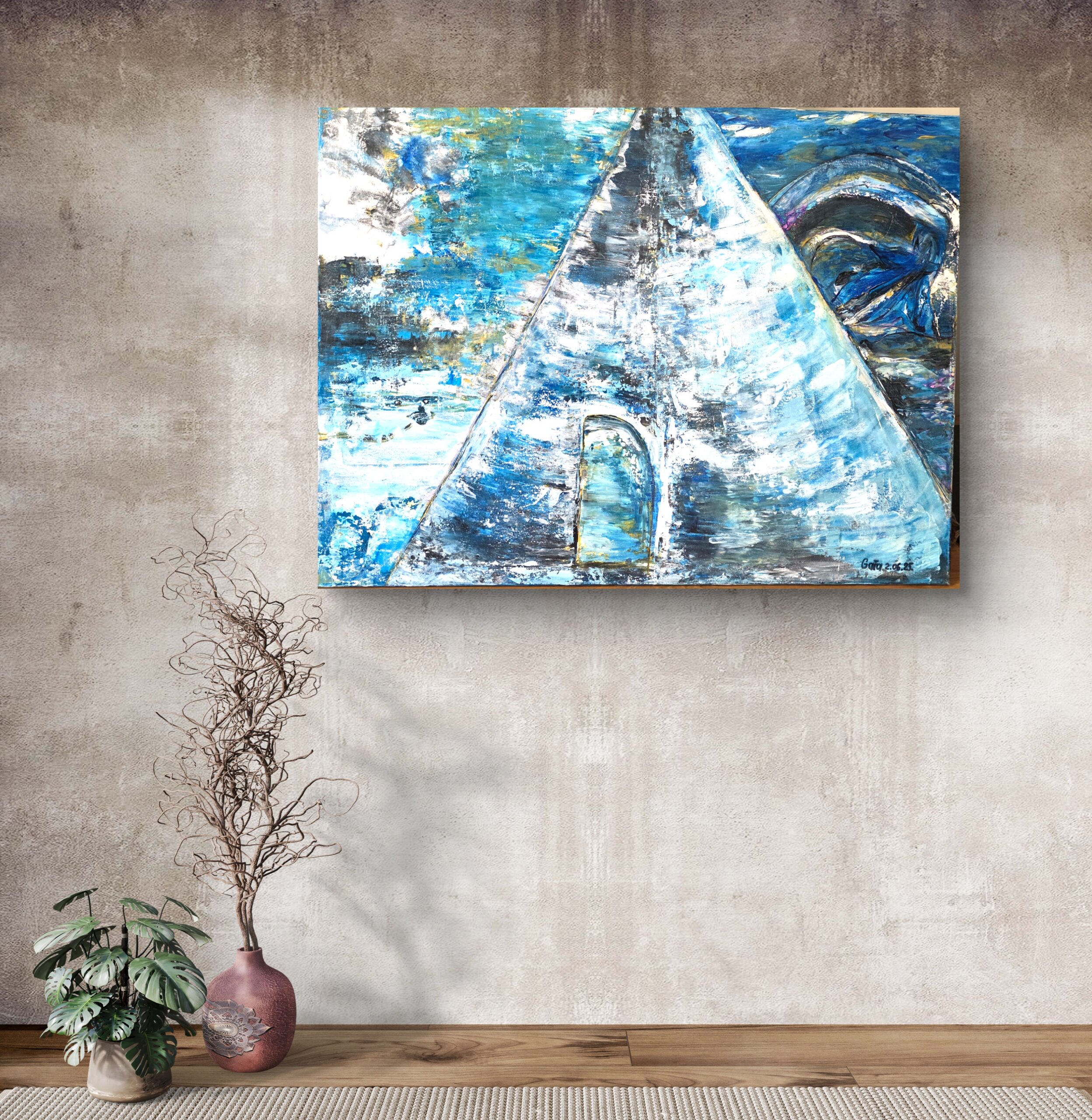 The composition is dominated by a monumental triangular form, reminiscent of a pyramid or an icy mountain, dividing the canvas into two contrasting spaces. The left side shimmers with broken blues, whites, and traces of gold, evoking the endless sky and frozen sea. The right side curves inward, as if opening a gateway into storm and shadow, where waves twist into almost cosmic turbulence. At the base of the structure appears an arched doorway — mysterious, unreachable, a passage into silence. The work captures the tension between the immensity of northern landscapes and the hidden threshold to otherworldly realms.