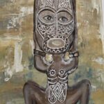 This artwork channels the spirit of tribal and ancestral cultures. The central figure, painted in earthy tones, carries intricate patterns resembling ritual tattoos or sacred carvings. Its posture and mask-like face evoke a sense of mystery, connecting the viewer to forgotten traditions, shamanic power, and the wisdom of civilizations long past. It stands as both guardian and storyteller — a bridge between the visible world and the unseen realms of human memory.