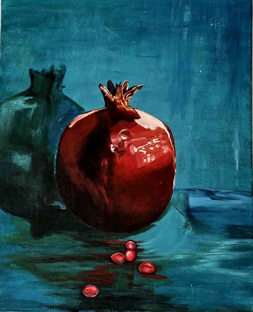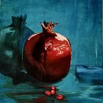 Against the depth of a teal background, the red fruit glows like a vessel of life. Its polished surface reflects light with an almost sacred intensity, while a few scattered seeds lie nearby like drops of blood, or scattered jewels. Behind it, a shadowy echo of another pomegranate suggests memory, continuity, or hidden abundance. The painting balances richness and restraint, turning the simple still life into a meditation on fertility, vitality, and the mystery enclosed within fragile skin.
