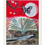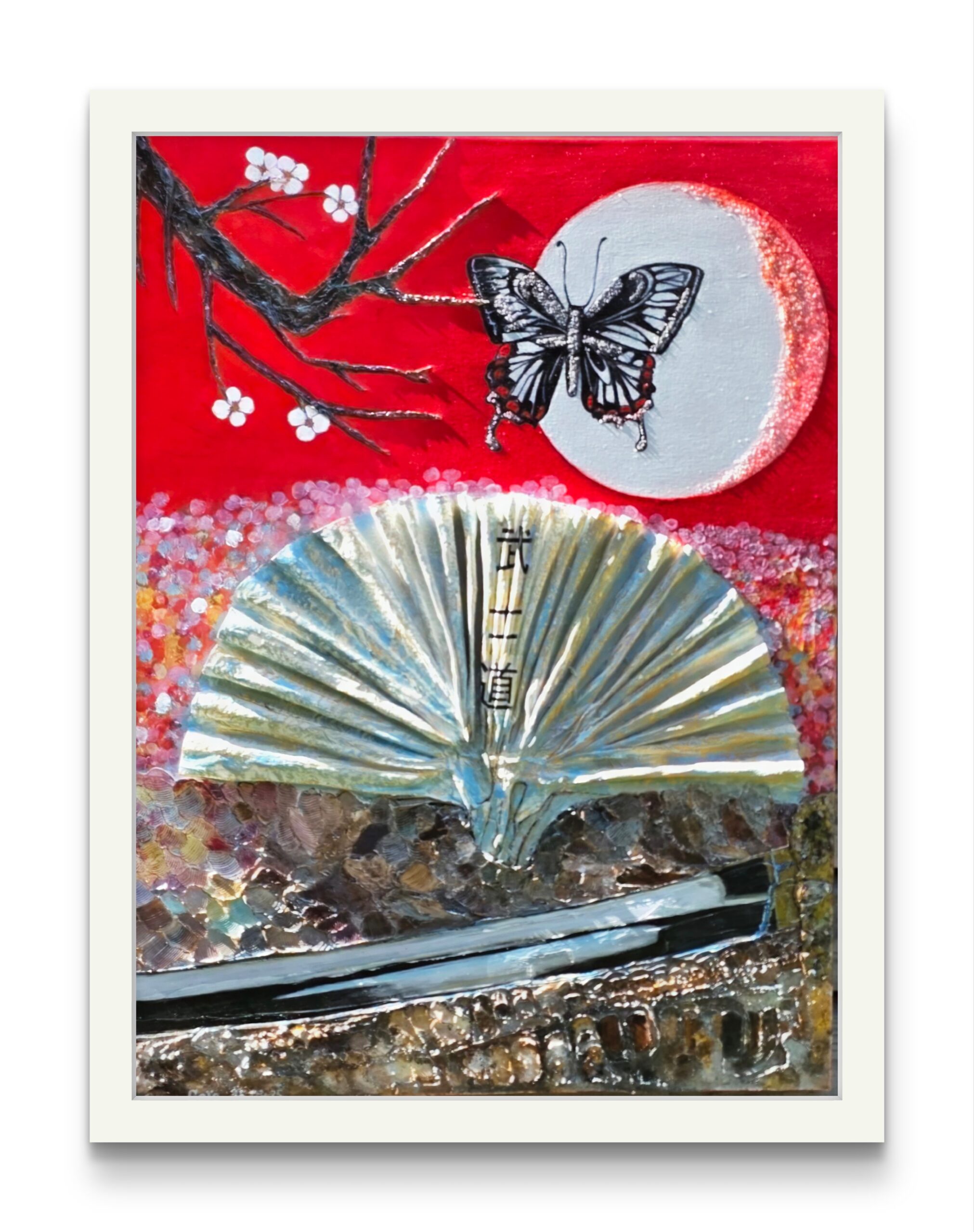A crimson sky becomes the stage for contrasts — fragility and strength, fleetingness and eternity. The butterfly hovers before the pale moon, its wings echoing both vulnerability and freedom. Below, a fan spreads open like a silent code, marked with the vertical script of Bushidō — the path of the warrior. A sword lies at the foundation, its steel shimmering as if reflecting centuries of honor and discipline. Between blossoming branches, delicate petals, and the solemn presence of the blade, the composition unites beauty and resolve, suggesting that true strength is always balanced by grace.