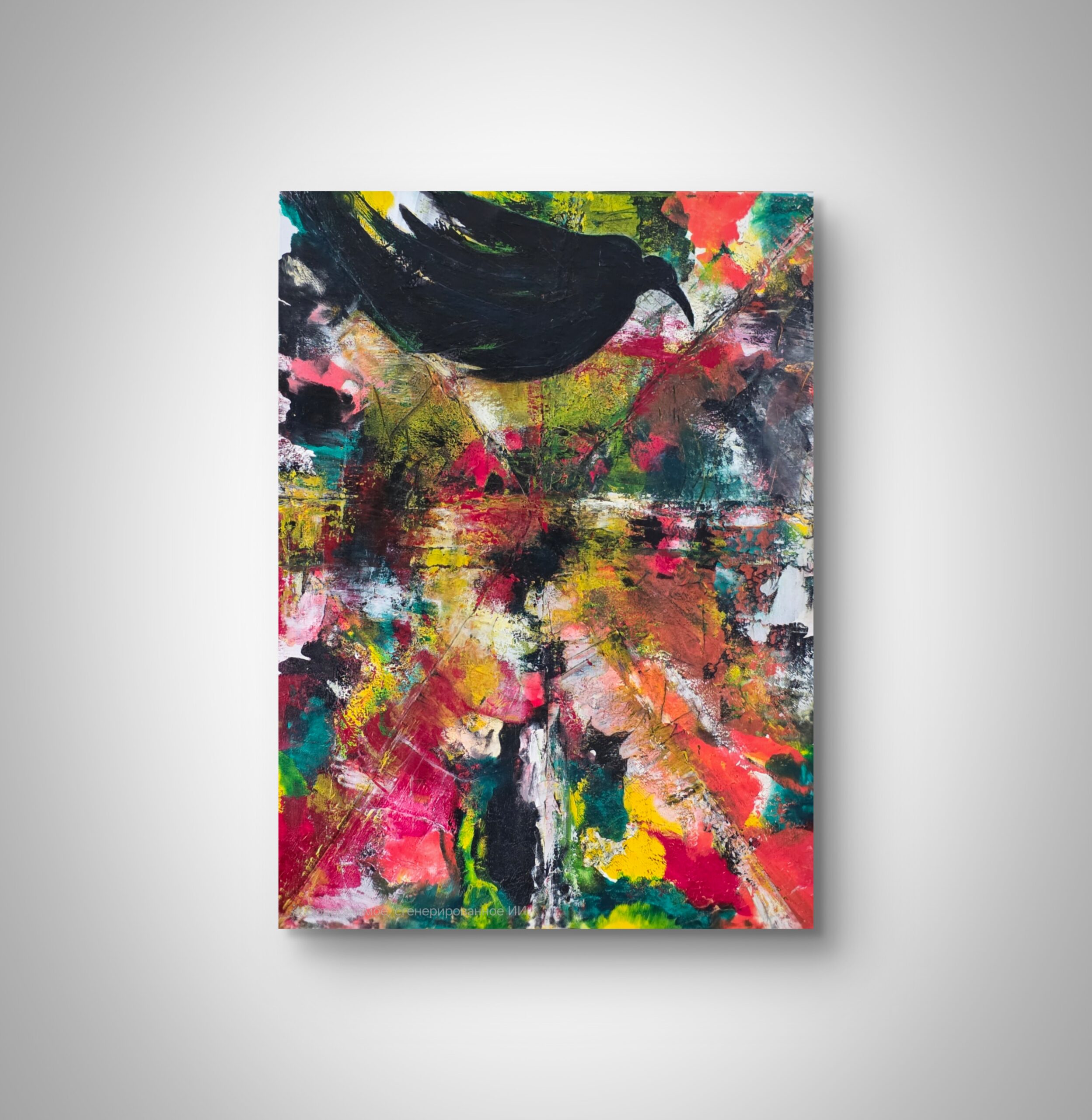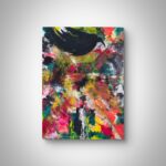 A bold and expressive composition where a black bird soars above a burst of radiant colors. Streaks of red, yellow, pink, and green clash and merge, forming an almost cosmic explosion of energy. The bird’s silhouette cuts through this storm of light, evoking memory, continuity, and the invisible thread that binds generations. The contrast between the dark figure and the vivid background suggests both fragility and strength — a flight through time, carrying the voices of those who came before.