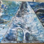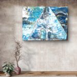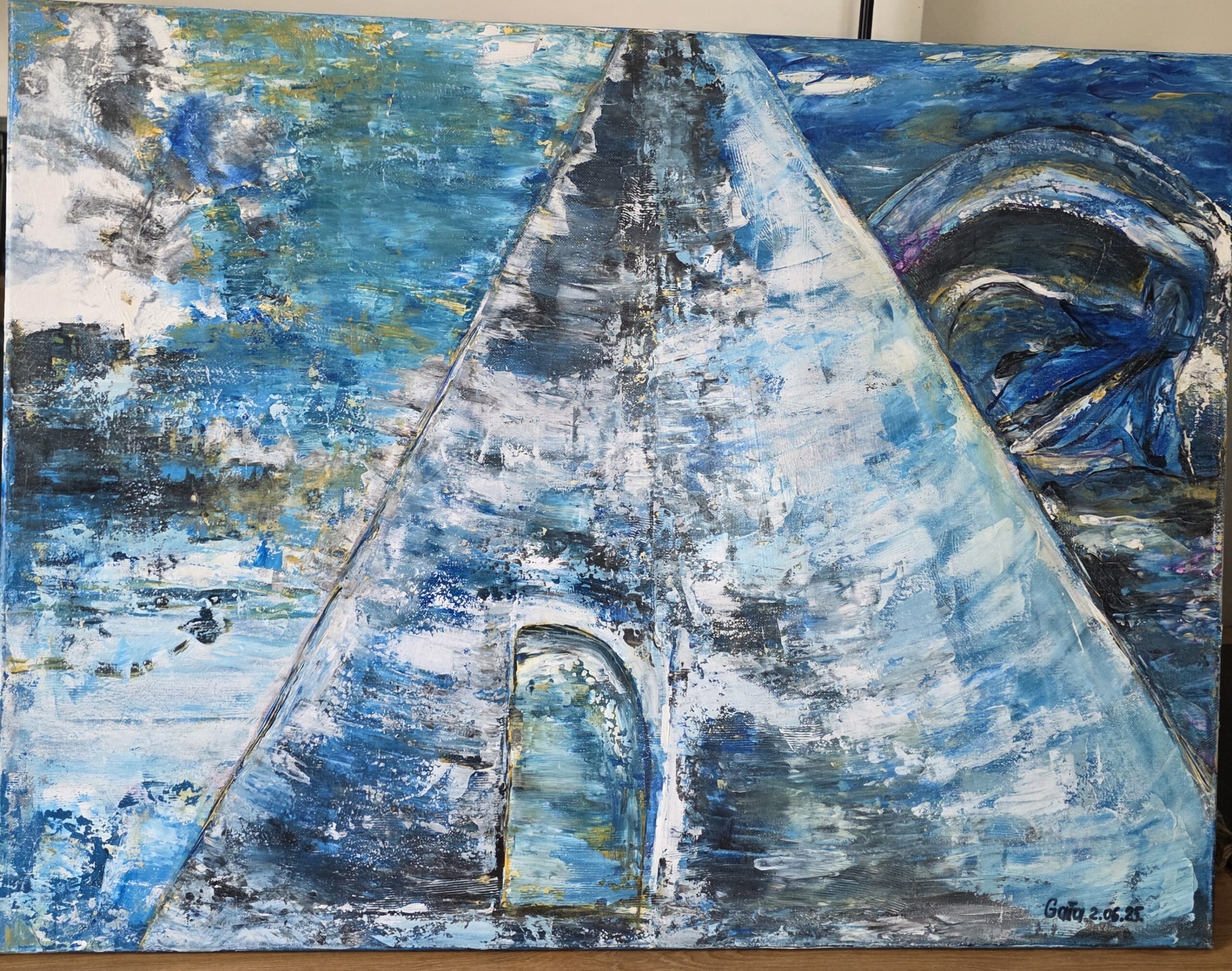The composition is dominated by a monumental triangular form, reminiscent of a pyramid or an icy mountain, dividing the canvas into two contrasting spaces. The left side shimmers with broken blues, whites, and traces of gold, evoking the endless sky and frozen sea. The right side curves inward, as if opening a gateway into storm and shadow, where waves twist into almost cosmic turbulence. At the base of the structure appears an arched doorway — mysterious, unreachable, a passage into silence. The work captures the tension between the immensity of northern landscapes and the hidden threshold to otherworldly realms.
