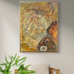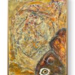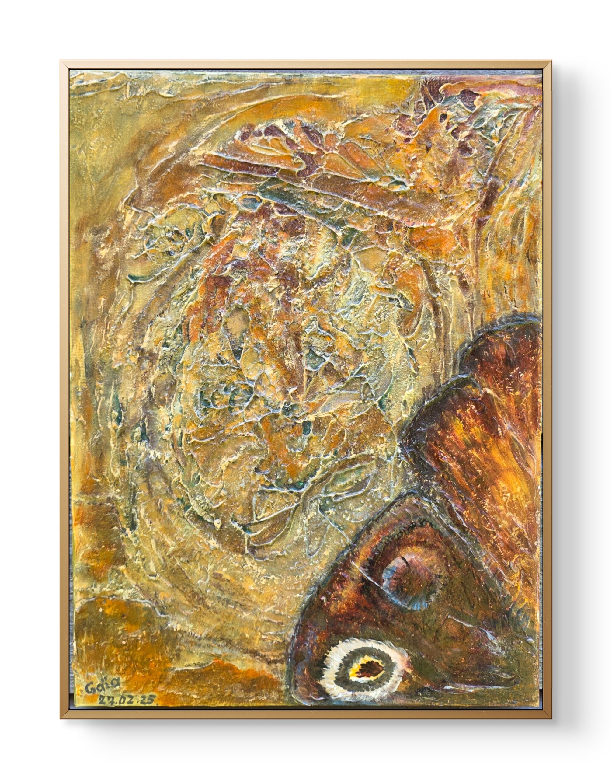 A fragment of a butterfly wing shimmers in the corner, its eye-like markings gazing outward as though carrying ancient knowledge. Around it, the canvas swirls with golden textures and weathered reliefs, reminiscent of stone walls or cosmic dust left from the birth of time. The wing is both fragile and eternal — a remnant of fleeting life, yet glowing with the quiet light of memory. The painting evokes the sensation of touching something primordial, where nature and eternity breathe as one.