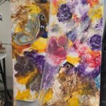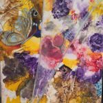 An abstract composition centered around champagne flutes set against a vivid background. Red, orange, yellow, and purple tones intertwine, creating the impression of a floral whirlwind. Within this play of colors, one can glimpse the shapes of butterflies and clusters of berries. The translucent flutes serve as a frame, both concealing and revealing the festive chaos behind them. The work is filled with energy and evokes a sense of joy and celebration.